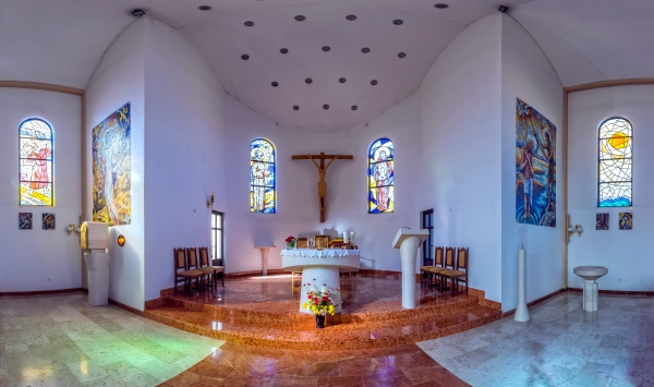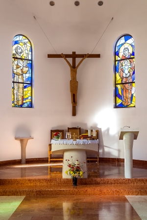 Na prozorskim otvorima u apsidi crkve postavljena su dva vitraja akademskog slikara Đure Sedera: sv. Franjo i sv. Anto (300x100 cm). Između njih svoje mjesto nalazi križ (260x210 cm, korpus 215x115 cm) izrađen u drvetu, rad akademskog kipara Mile Blaževića. Blaženka Salavarda je na zidnim plohama ispred prezbiterija izradila dva mozaika u umjetnom kamenu s motivima Uskrsnuća i Krštenja na Jordanu (300x175 cm). Ista umjetnica je u mozaiku napravila i četrnaest postaja križnog puta.
